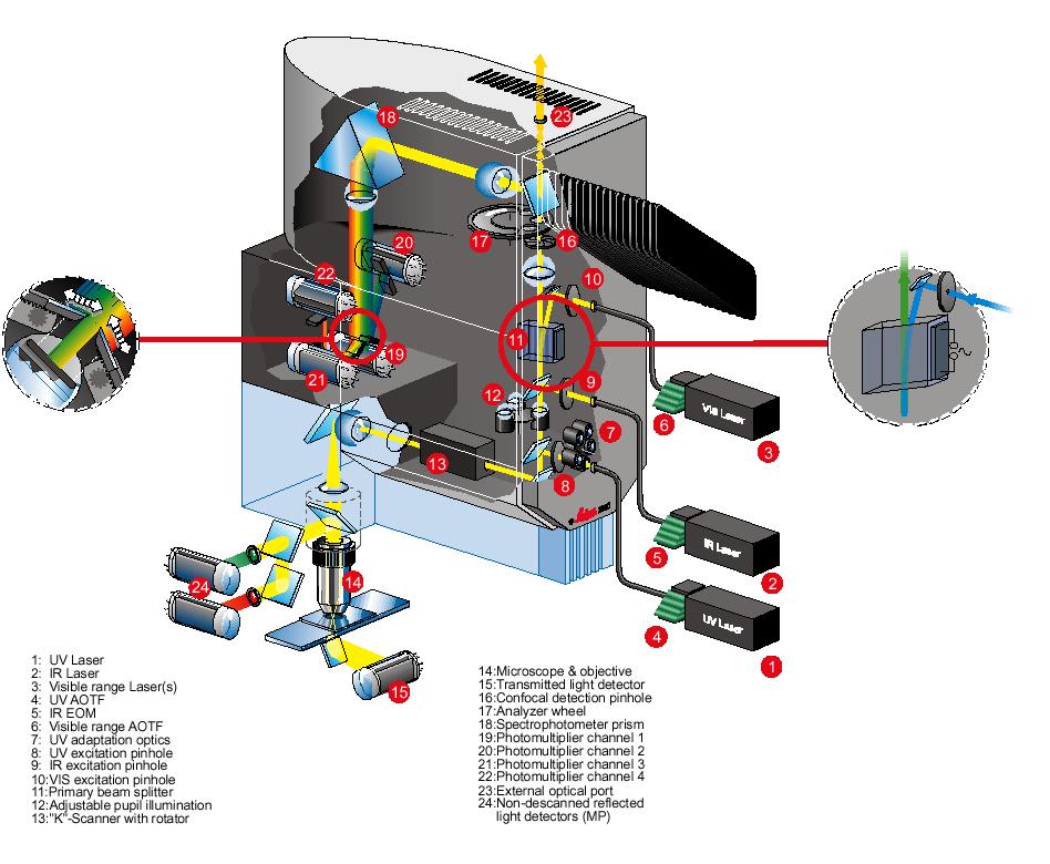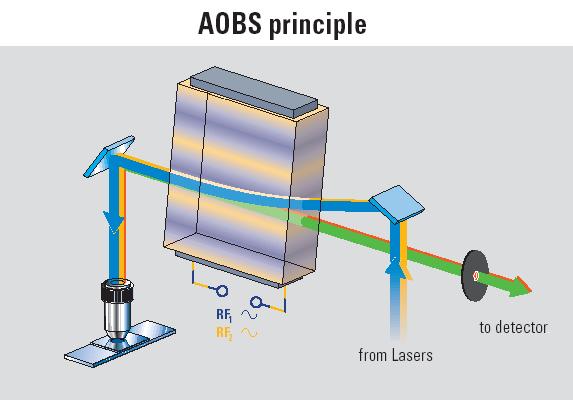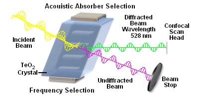 Le singole o multiple linee di eccitazione sono deflesse sul campione tramite l'applicazione di opportune frequenze al cristallo. La fluorescenza di ritorno generata dal campione passa indisturbata e viene diretta al pinhole del confocale ed quindi al prisma-detector per la rilevazione.